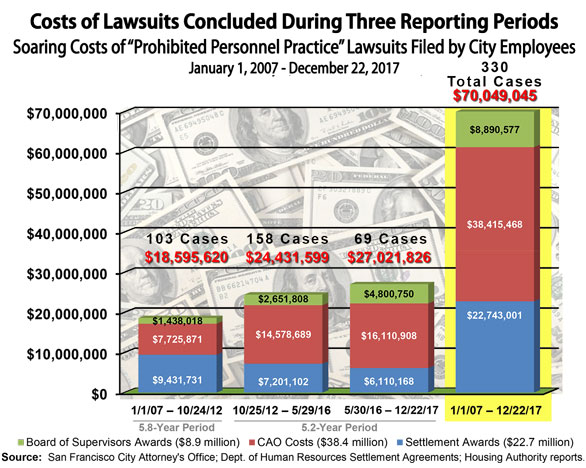 Fully 54 wrongful termination lawsuits have been settled since 2005, at a cost of $17.8 million between settlement awards and City Attorney time and expenses fighting the lawsuits.Another 9 wrongful termination cases remain pending, with additional costs to come.Combined with the 39 sexual harassment and discrimination cases, that brings us to a total of 102 lawsuits between the three lawsuit categories.